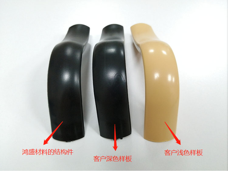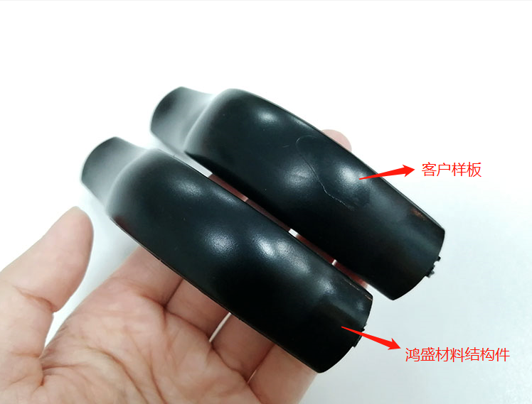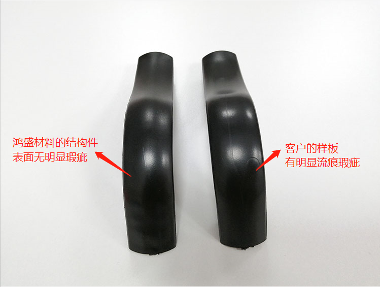 可以看到,對比起客戶寄來的深色樣板,鴻盛的材料在同樣的機臺同樣的深色下注塑出來的結構件表面無明顯流痕,不影響美觀,顏色也很均勻。