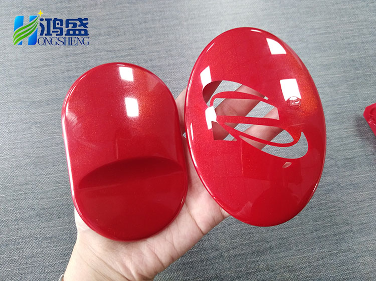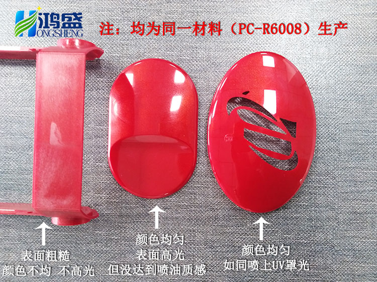 右邊是另一位客戶的樣板,是在140°模溫下通過高光模具注塑出來的,這個跟中間的色牌效果差別不是特別大,但仔細看質感上還是有一點差別,中間的雖然也高光,但質感還是有點粗糙,沒完全達到鏡面效果。而右邊這個則如同真的噴過UV一樣,達到了噴涂的高光鏡面質感。