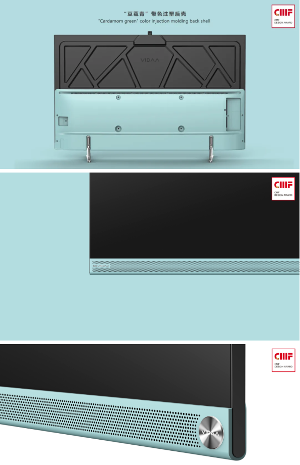 海信V3F系列電視榮獲2020國際CMF設計獎,竟是用了免噴涂材料?在本次國際CMF設計獎評選中,海信V3F系列電視將“豆蔻青”色彩在黑電中的“大面積”“大膽”應用,亮點在于用環(huán)保免噴涂材料做成的帶色注塑前出音網(wǎng)罩,質(zhì)感和時尚感十足。