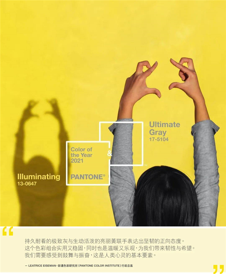 Pantone公布2021年度流行色,“輝煌”組合傳遞正能量 近日,全球知名色彩開發和研究機構潘通色彩研究所(Pantone Color Tnstitute)發布了2021年度流行色,極致灰(PANTONE 17-5104 Ultimate Gray)與亮麗黃(PANTONE 13-0647 Illuminating),意在傳達持久振奮的力量與希望。這也是自2016年雙色調水晶粉+寧靜藍之后的第二個雙色調組合。