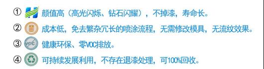 通過大量使用汽車免噴涂塑料制件,汽車可以輕量化,從而達到減排,降低油耗,減少環境污染的效果,免噴涂塑料還從源頭上控制了VOC的產生,從而減輕了霧霾,可以看出,使用免噴涂塑料,是汽車環保之路的必然選擇。
