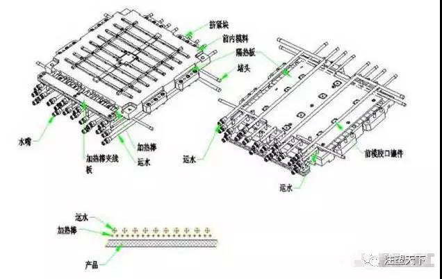 4.加熱方式模具加熱的方式通常有水蒸氣(熱水)加熱和電熱棒(管)加熱兩種。水蒸氣(熱水)加熱方式是通過特定的溫控機在注塑過程中給模具輸入蒸氣(熱水),從而使模具快速升溫;在注塑完后用冷水冷卻模具,使模具快速降溫。電加熱的方式與水加熱溫控機,在原理上是一樣的,就是熱源不一樣,電加熱是二次能源,水加熱是三次能源,按原理來說電加熱能源損耗少,利用率高、節能效益好。使用方便、所以說:如果是平板(面)產品還是采用電加熱方式實惠。