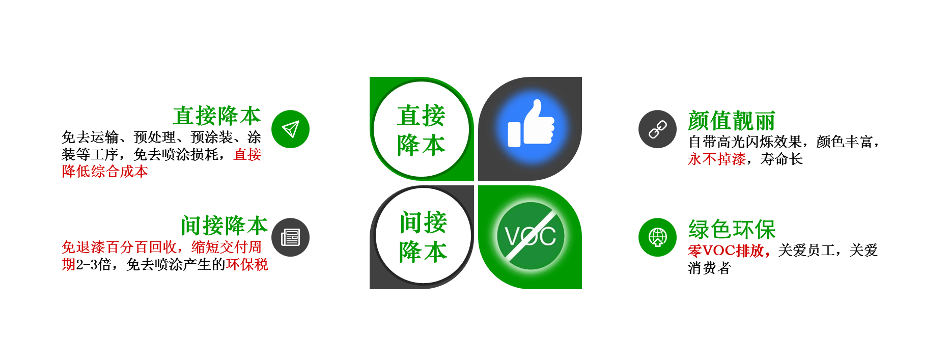 免噴涂材料是一種無需噴涂,可以直接注塑或擠出加工成不同的塑料制件,且自帶絢麗多彩外觀效果的材料。免噴涂制品擁有以下幾個共同優點: