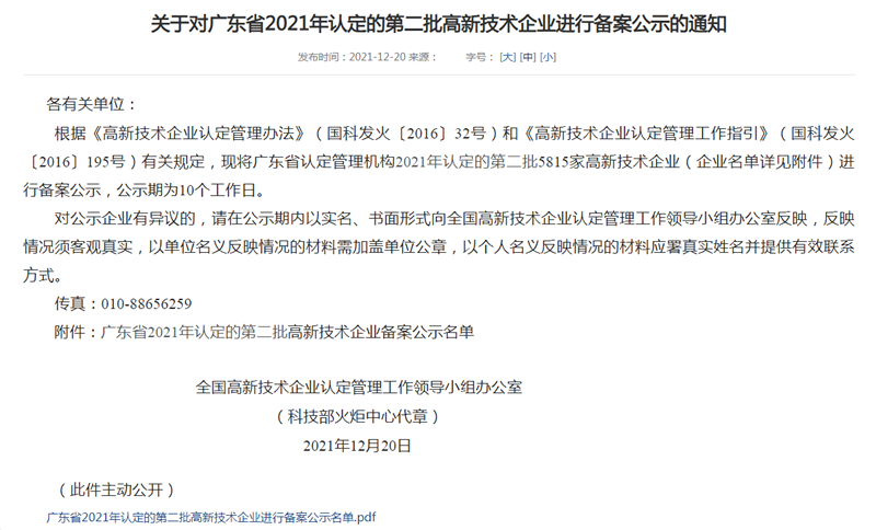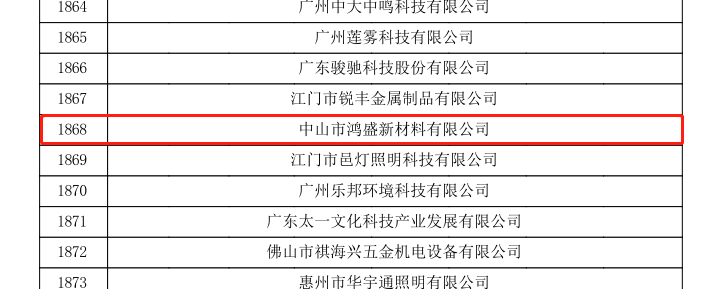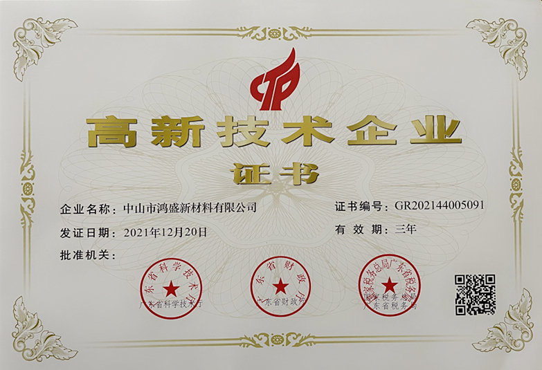 2021年12月20日,全國高新技術(shù)企業(yè)認(rèn)定管理工作領(lǐng)導(dǎo)小組辦公室發(fā)布《關(guān)于對廣東省2021年認(rèn)定的第二批高新技術(shù)企業(yè)進(jìn)行備案公示的通知》,中山市鴻盛新材料有限公司名列其中,成為國家重點支持的具有高成長性的企業(yè)。