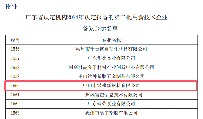 喜報:中山鴻盛新材料再次榮獲高新技術企業 近日,全國高新技術企業認定管理工作領導小組辦公室根據有關規定,公示了廣東省2024年認定報備的第二批高新技術企業名單,中山鴻盛新材料有限公司再次通過認定,被授予“國家高新技術企業”稱號,這是公司自2018年首次被認定為高新技術企業以來,第三次成功通過高新技術企業認定。